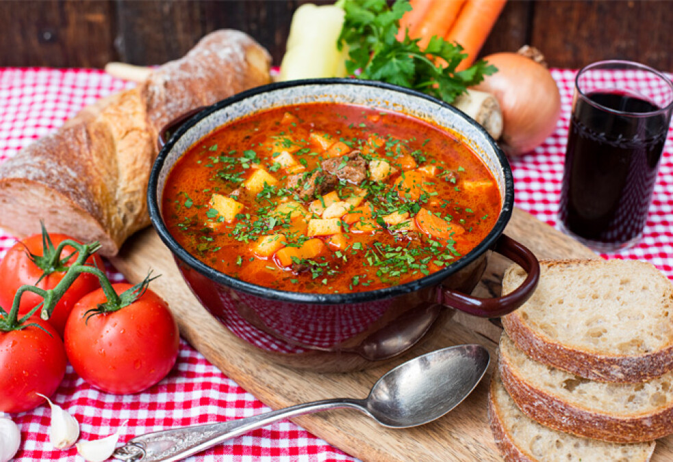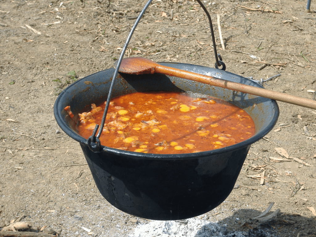 Un plat bien connu de la cuisine hongroise mais souvent mal interprété en France, le gulyás est composé de boeuf, carottes, pommes de terres, paprika et diverses épices, le tout mélangé dans une soupe. (cf. la photo de gulyás juste au-dessus) Une soupe ? Oui, une soupe, le gulyás n’est pas un plat en sauce ou un ragout mais bel et bien une soupe. Véritable monument de la cuisine hongroise qui a su traverser les frontières, le gulyás reste une institution très appréciée des hongrois et se cuisine traditionnellement dans un bogrács, sorte de grosse marmite servant à cuire les aliments à l’extérieur sur un feu ouvert.