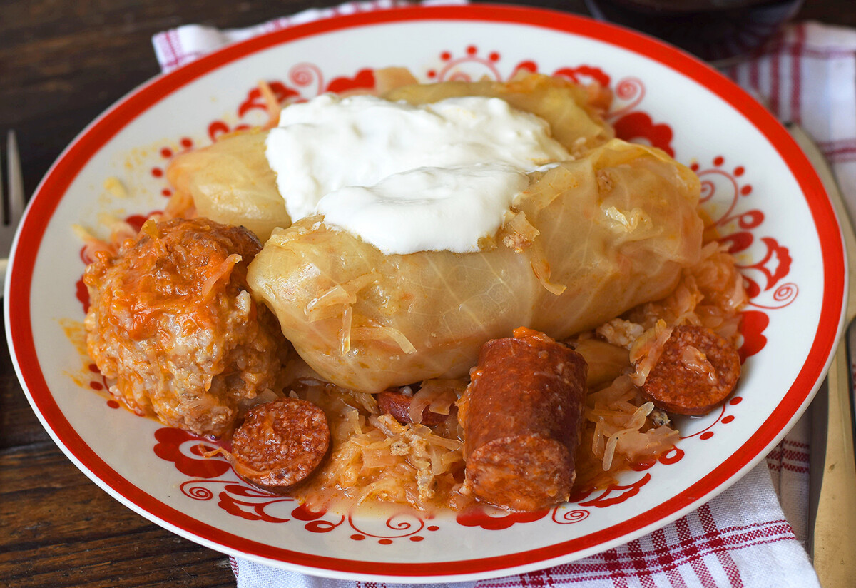 Facilement traduit par chou farci. N’en déplaise à ma grand-mère les hongrois sont spécialistes du chou farci. Il en existe 2 sortes, acides et non acides, les hongrois préfèrent la première sorte en général. Traditionnellement ce plat est servi à minuit lors des mariages, voir les Traditions